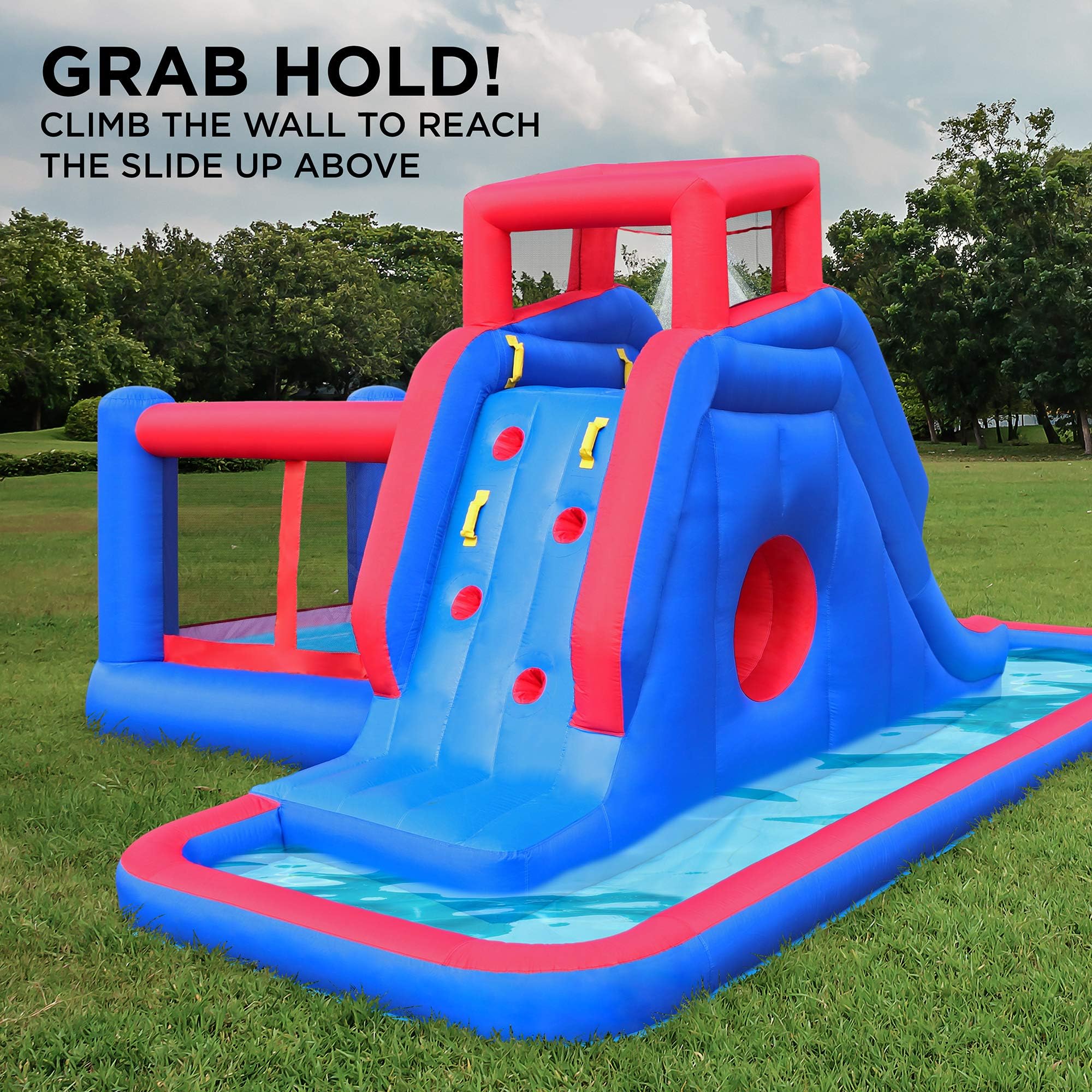 Loaded with features, it includes a climbing wall, water slide, bouncer area, tunnel, toss rings, water guns, and a splash-down pool to keep multiple kids entertained at the same time. The variety of activities keeps the fun going while encouraging active play.
