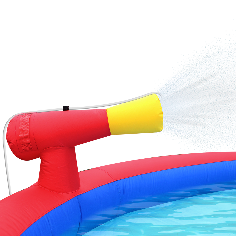 The fast-inflating instant playground includes not only the climbing wall, with durable cloth handles and foot holds, but also a fun water slide leading into a splashdown pool. Kids can crawl through the miniature tunnel underneath the slide for extra excitement, while enjoying the large integrated water gun facing the slide. Atop the slide, they’ll pass through a shower from the water sprayer at the top, which also serves to keep the slide cool and moist during play.